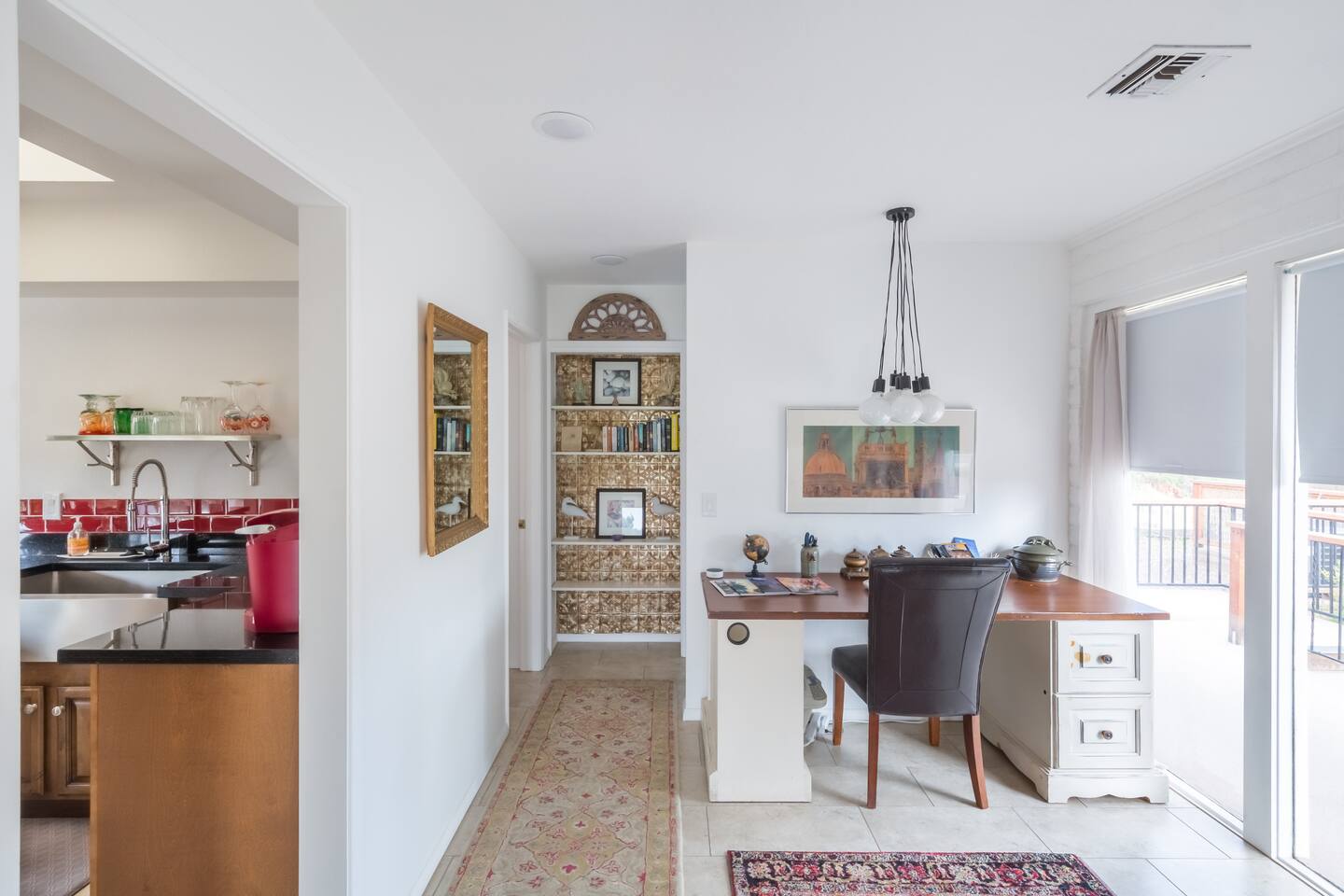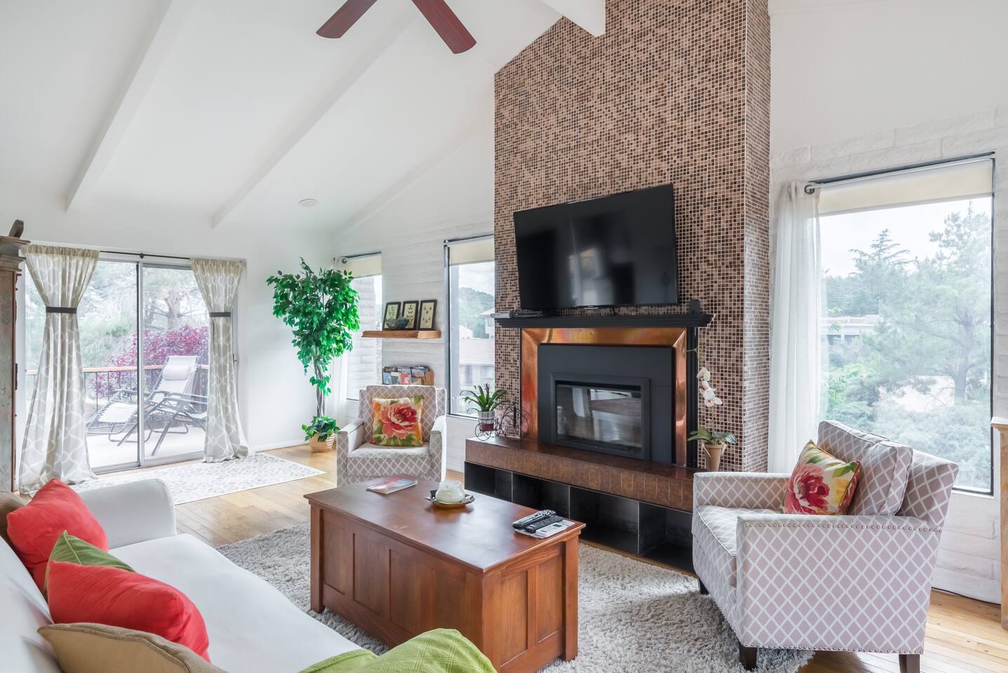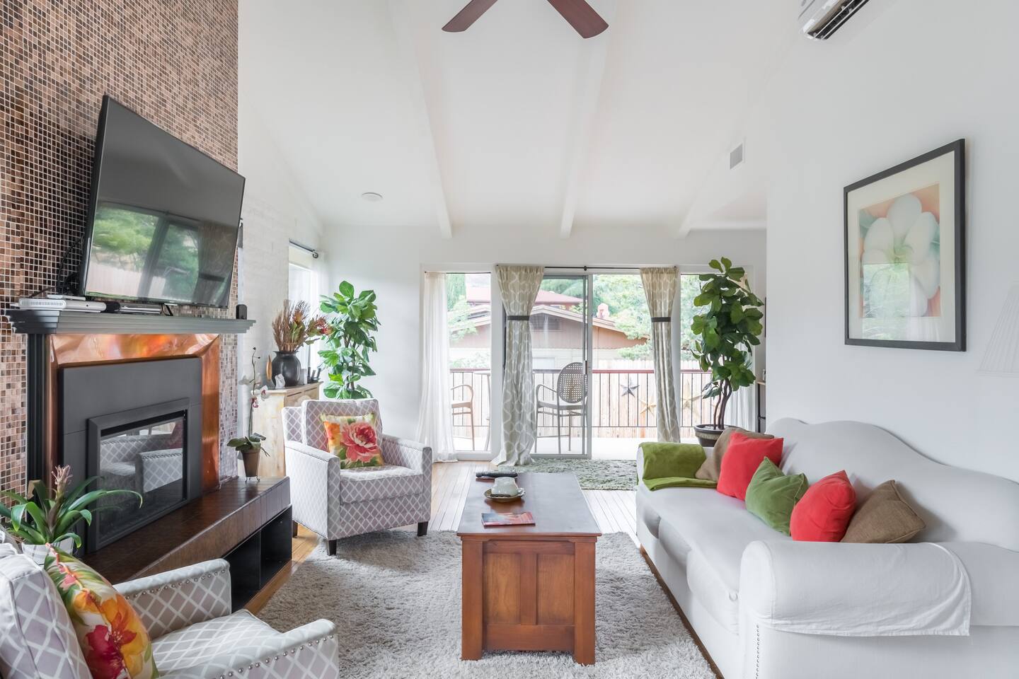 Inside, the space is bright and calm with high ceilings and natural light throughout. King bed with blackout shades and quality linens, an electric fireplace for evenings in, and a 65" Roku TV. The kitchen is fully stocked — Keurig, full cookware, spices, wine glasses, everything you'd need for a relaxed meal in. Fast Wi-Fi and a proper workspace if you're traveling with work in tow.