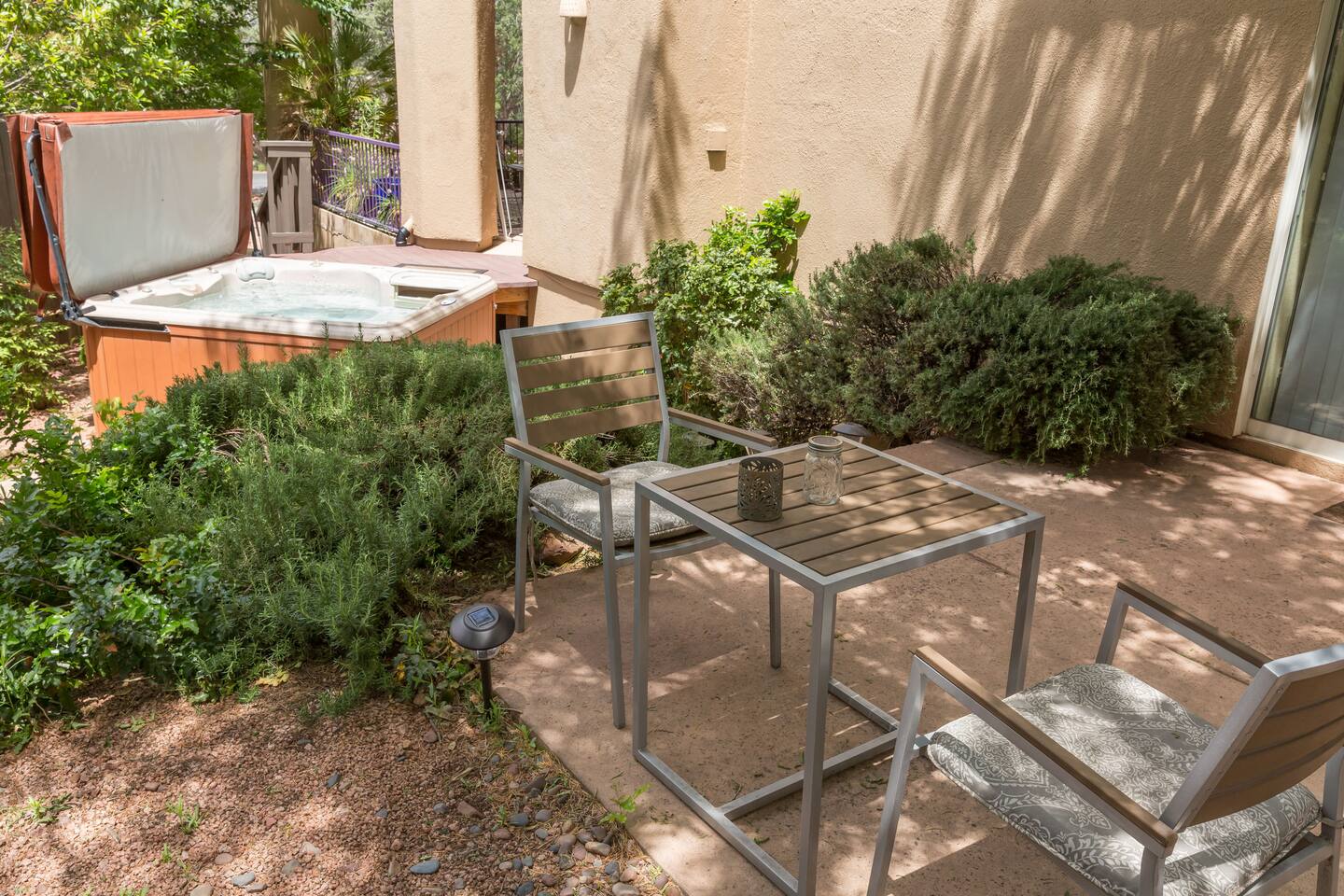 The private hot tub is the centerpiece — soak under Sedona's dark skies while the red rocks sit in silhouette around you. The courtyard is genuinely secluded, with outdoor dining, loungers, and a gas BBQ for evenings that don't need to go anywhere.