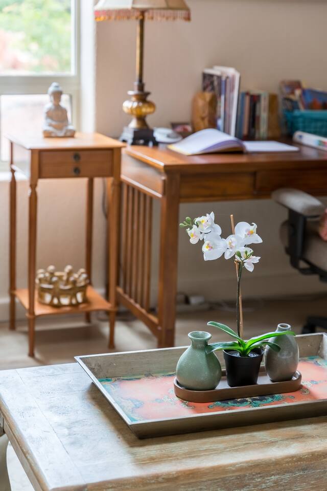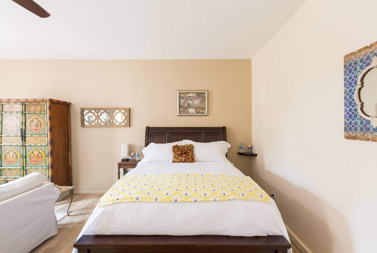 Inside, the casita is thoughtfully equipped for a restorative stay. Premium linens and layered bedding for deep sleep. A whole-house mineralized water filtration system — the same LifeSource technology used in Kaiser Permanente facilities — means clean, mineral-balanced water from every tap and shower. An Alen air filtration system, EMF mitigation, split-duct heating and cooling, and Tesla Powerwall backup round out a space that takes comfort seriously without making a fuss about it.