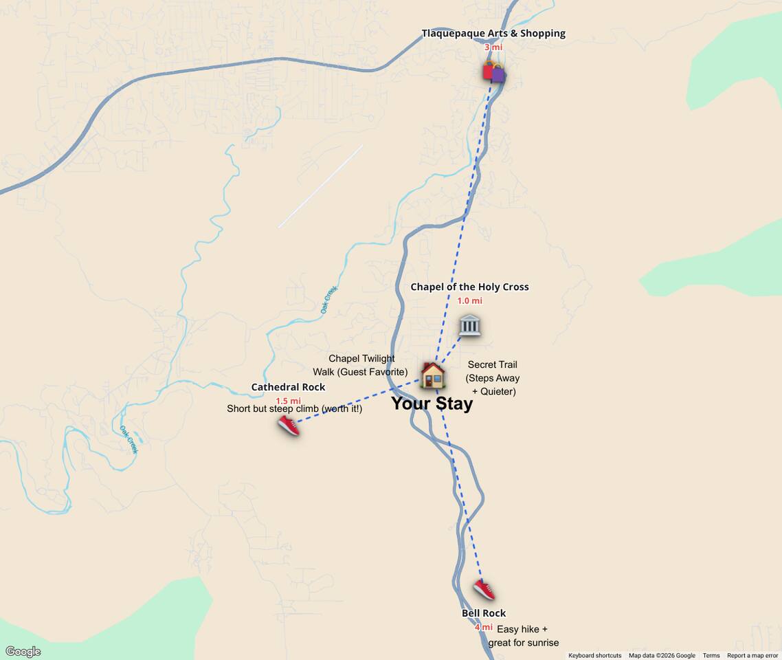 A private wellness casita tucked near the Chapel of the Holy Cross — trail access from the front door, a stargazing hot tub, and red rock views that don't quit. Designed for people who come to Sedona to genuinely reset.